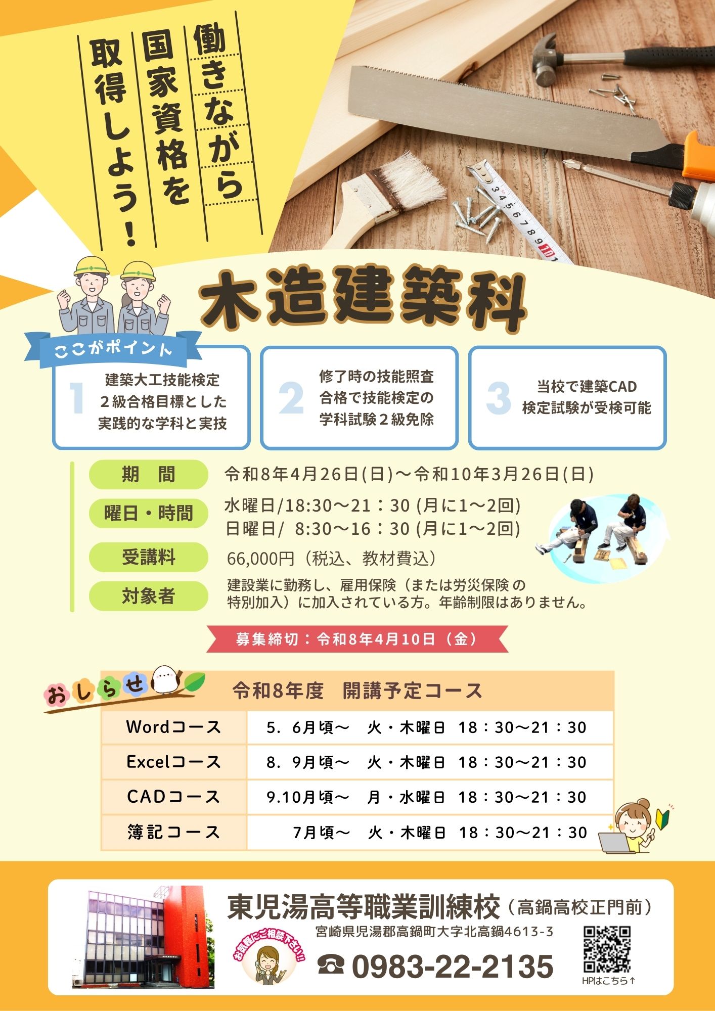 内 容 : 木造建築物の施工計画及び工作作業の技法・技能士検定課題演習等
