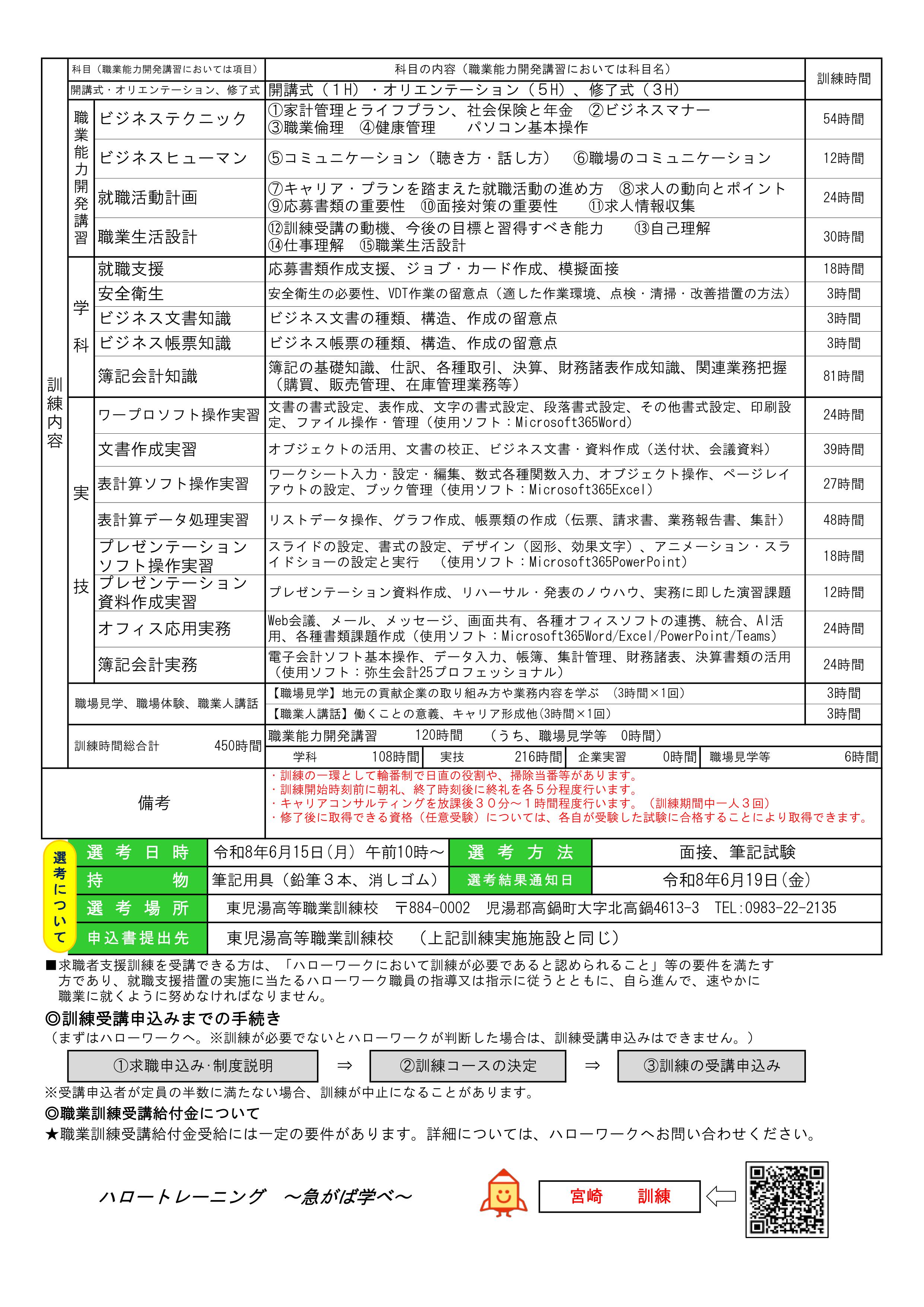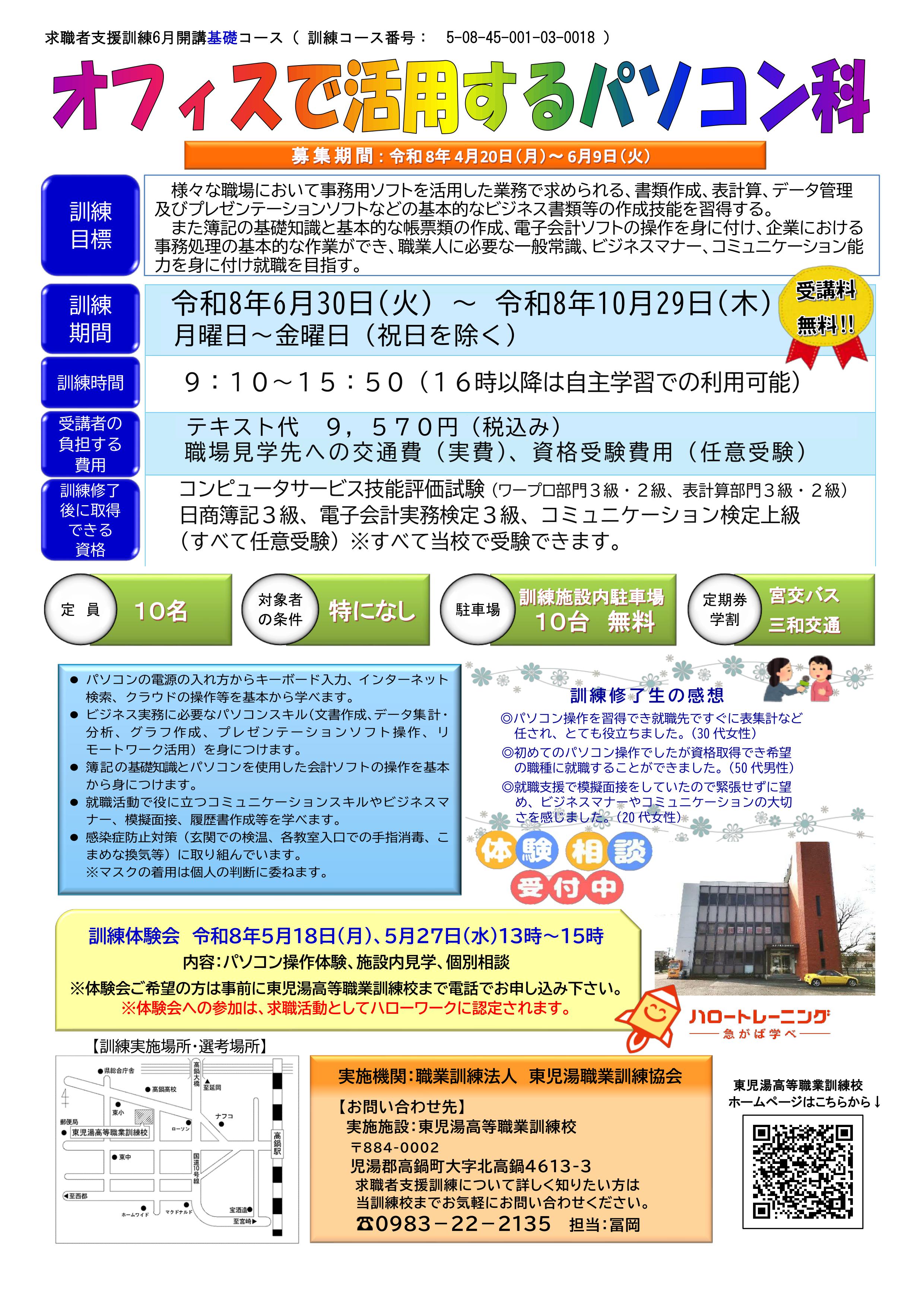 相談・お申し込みはハローワークまで、訓練の詳しい内容は東児湯高等職業訓練校までお問い合わせください。